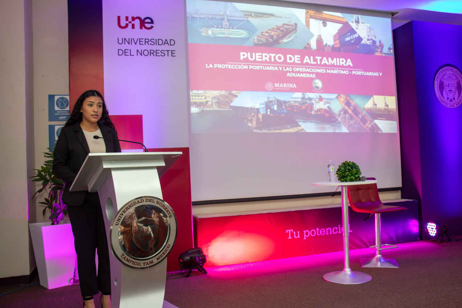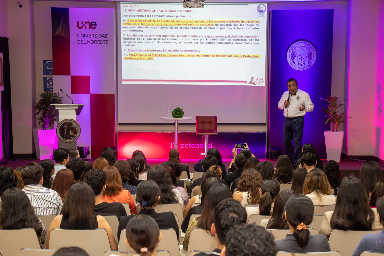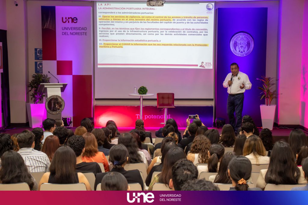El martes 12 de marzo, el Capitán de Marina Fernando Cruz Moreno ofreció una conferencia en la Universidad del Noreste, donde abordó el tema de la Administración del Sistema Portuario Nacional (ASIPONA) y su importancia en el contexto de la Licenciatura en Comercio Exterior y Aduanas.