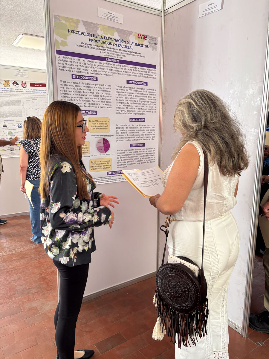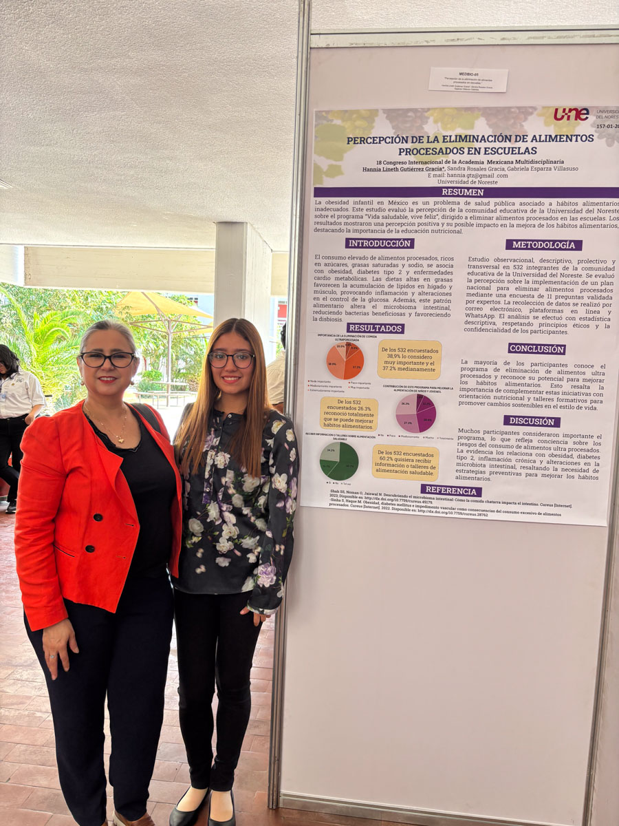 Como parte de la participación institucional, la alumna Hannia Linneth Gutiérrez Gracia, de la Licenciatura en Nutrición, presentó el trabajo “Percepción de la eliminación de alimentos procesados en escuelas”, desarrollado en colaboración con la Dra. Sandra Rosales Gracia, Coordinadora de Investigación del Área de Ciencias de la Salud, y la Mtra. Gabriela Esparza Villasuso, Directora de la Lic. Nutrición.