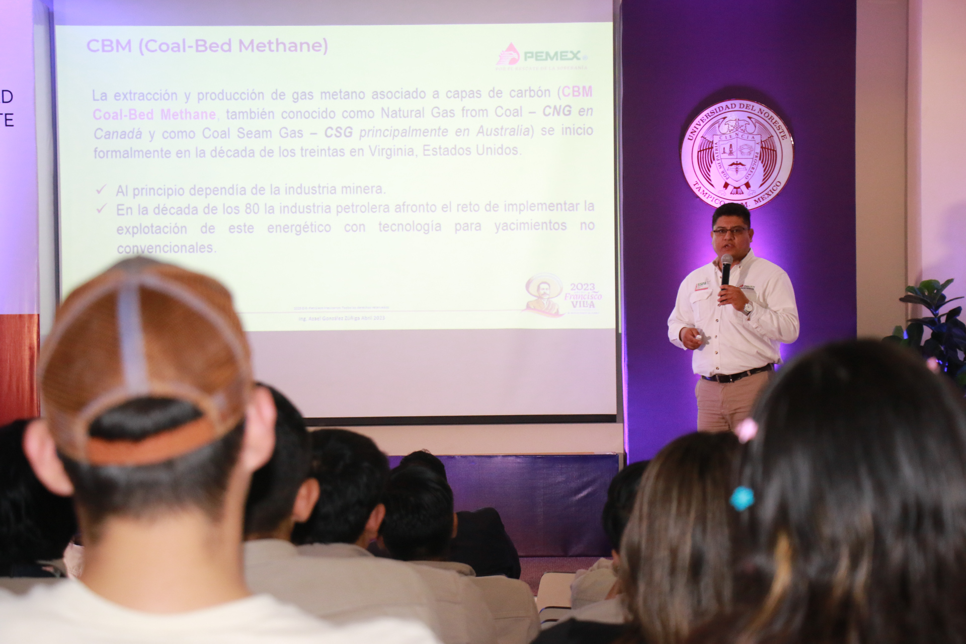 Las conferencias estuvieron a cargo del Ing. Ariel Peña Alcaraz, del corporativo MEXPLUS en la terminal OTM S.A. de C.V; Ing. Azael González Zuñiga, Ingeniero Operador de Registros y Disparos de la Unidad de Servicios a Pozos Norte Sector Operativo Altamira; Ing. José Daniel Guerrero Martínez, Experto Técnico en Línea de Acero en la Unidad de Servicio a Pozos Norte, que contempla las bases operativas de Reynosa, Altamira, Poza Rica y Veracruz y el Ing. Pablo Ramírez Gil, Gerente de Planeación en Diavaz DEP Petróleo y Gas.