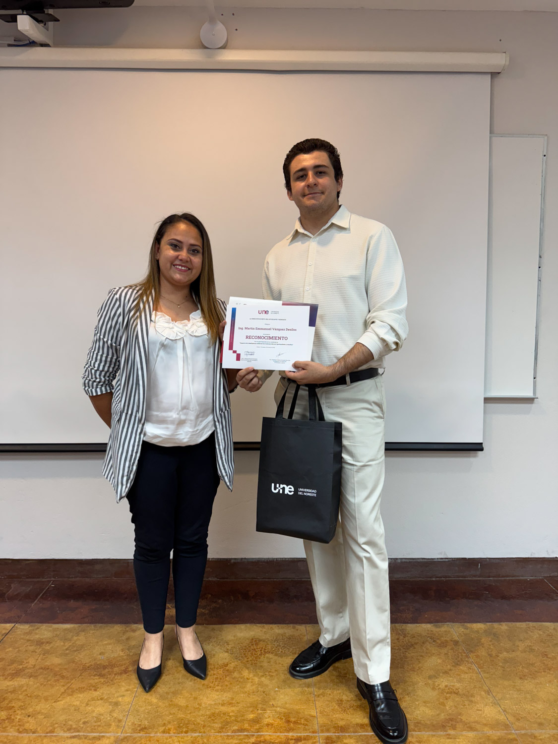 Al finalizar la presentación, la Mtra. Sandra Alicia Benítez Martínez, presidenta de la Sociedad de Egresados, hizo entrega de un reconocimiento al Ing. Vázquez Desilos por su valiosa aportación y dirigió un mensaje resaltando la importancia de mantenerse actualizados ante los avances tecnológicos y la necesidad de impulsar espacios de aprendizaje continuo que fortalezcan la competitividad de los egresados UNE en el ámbito laboral. Asimismo, agradeció la participación activa de las empresas asistentes y reiteró el compromiso de la Sociedad de Egresados para seguir promoviendo actividades de vinculación y desarrollo profesional.