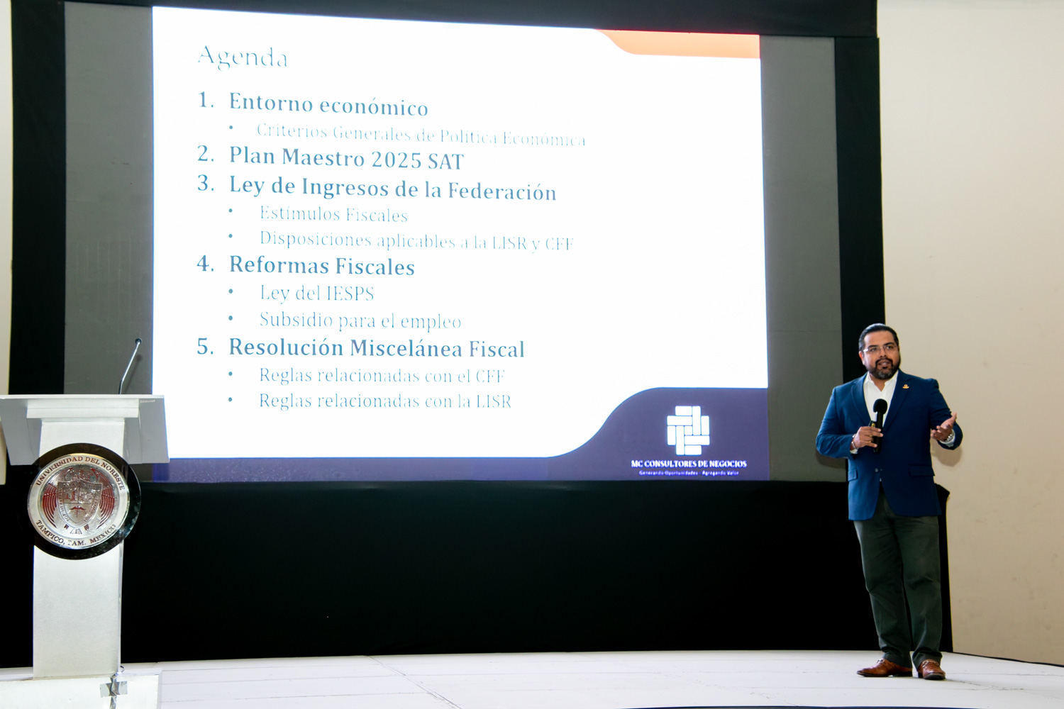 La jornada comenzó con la primera ponencia, titulada Reformas Fiscales, impartida por el Contador Público Certificado César Jerónimo Martínez Carrillo, Director de Tax and Legal en MC Consultores de Negocios y catedrático de la UNE.