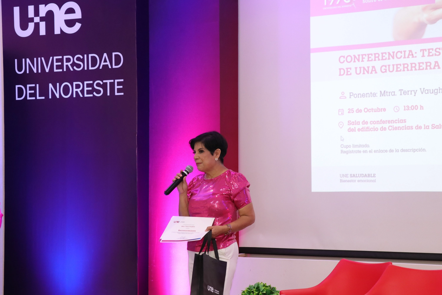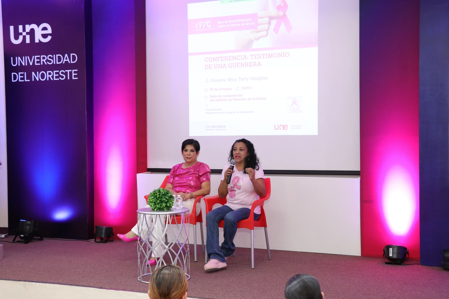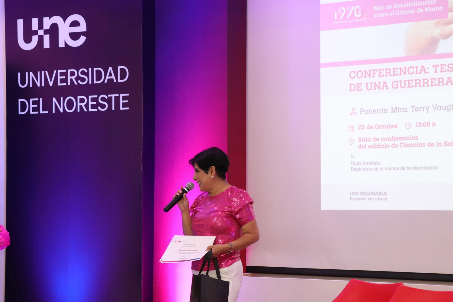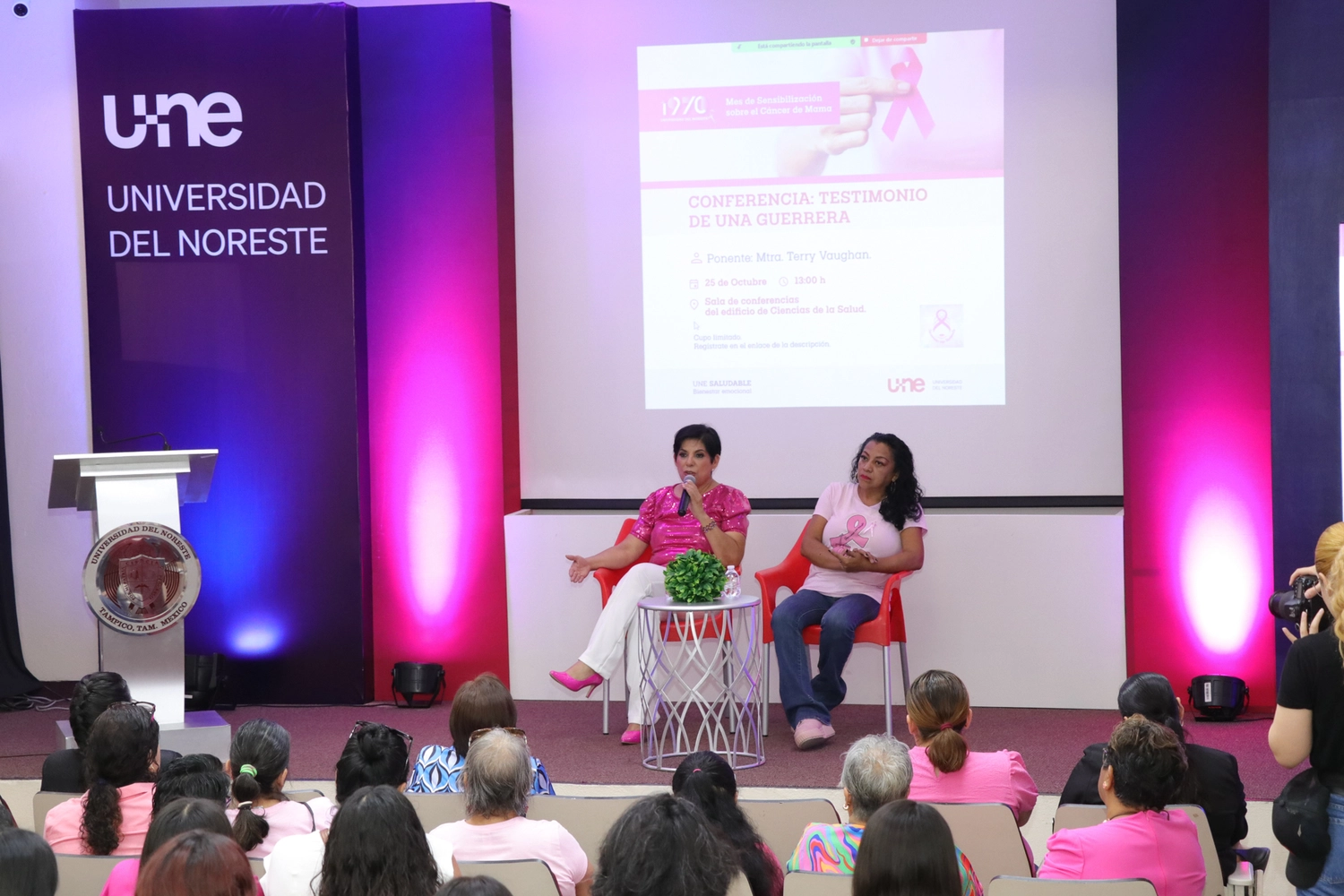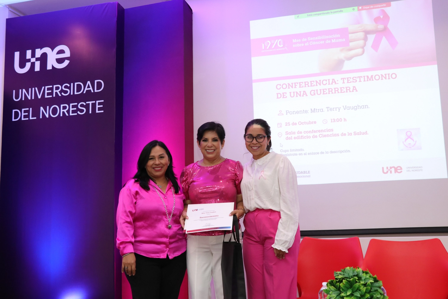 La jornada concluyó el 25 de octubre con la conferencia “Testimonio de una Guerrera”, a cargo de la Mtra. Terry Vaughan en colaboración con la Asociación Guerreras con Turbante. Este emotivo encuentro cerró las actividades del Mes Rosa en la UNE, dejando una huella profunda en los asistentes, quienes se llevaron una lección de valentía y esperanza.